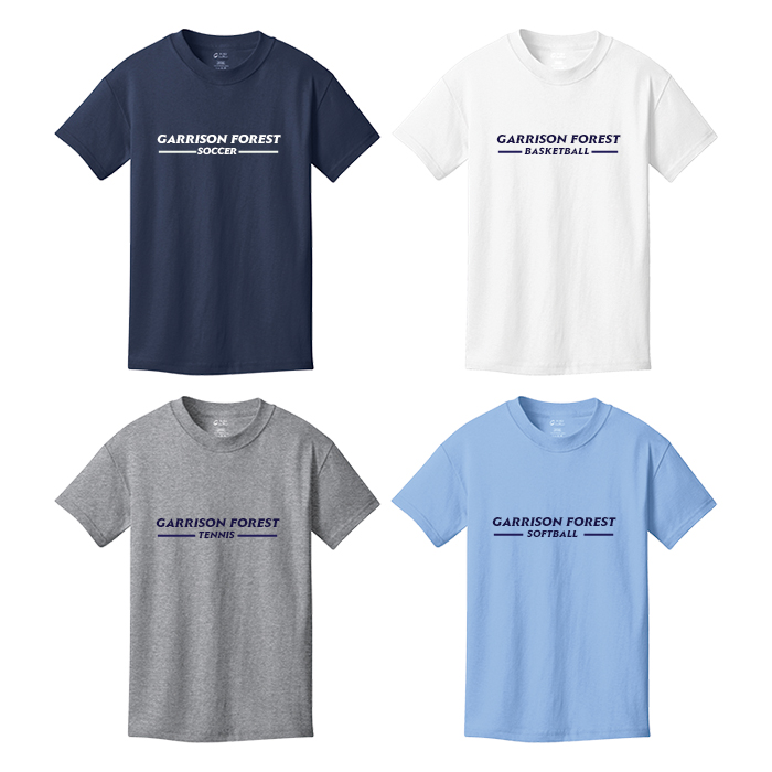 Garrison Forest AthleticsYouth 100% Cotton Short Sleeve Tee - $18This classic tee is a wardrobe essential. It is made of durable, yet soft, 100% cotton.